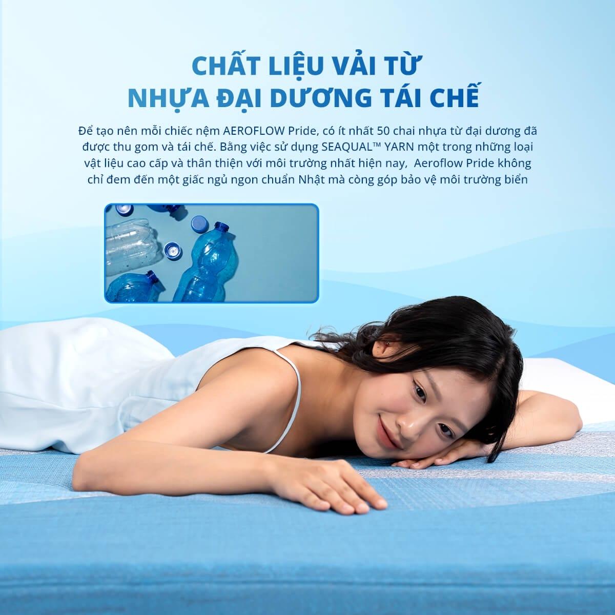 Aeroflow Pride nệm foam Nhật Bản, lớp Adaptive Foam nâng đỡ từng vùng cơ thể, Core foam cắt rổ trứng thoáng khí, áo nệm SEAQUAL™ YARN chống nước kháng khuẩn, mang đến giấc ngủ sâu, bảo vệ sức khỏe và môi trường.