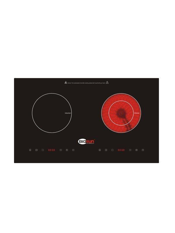 Bếp âm kết hợp điện từ & hồng ngoại Bigsun BEH-2IF, hai vùng nấu hiện đại ( điện từ+hồng ngoại), mặt kính chịu nhiệt, điều khiển cảm ứng + nút vặn, lắp âm bếp sang trọng – giúp bạn nấu nhanh, tiết kiệm điện và nâng tầm căn bếp