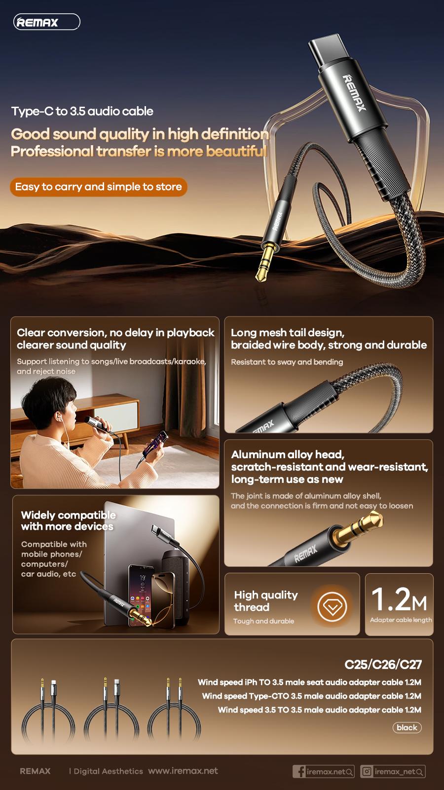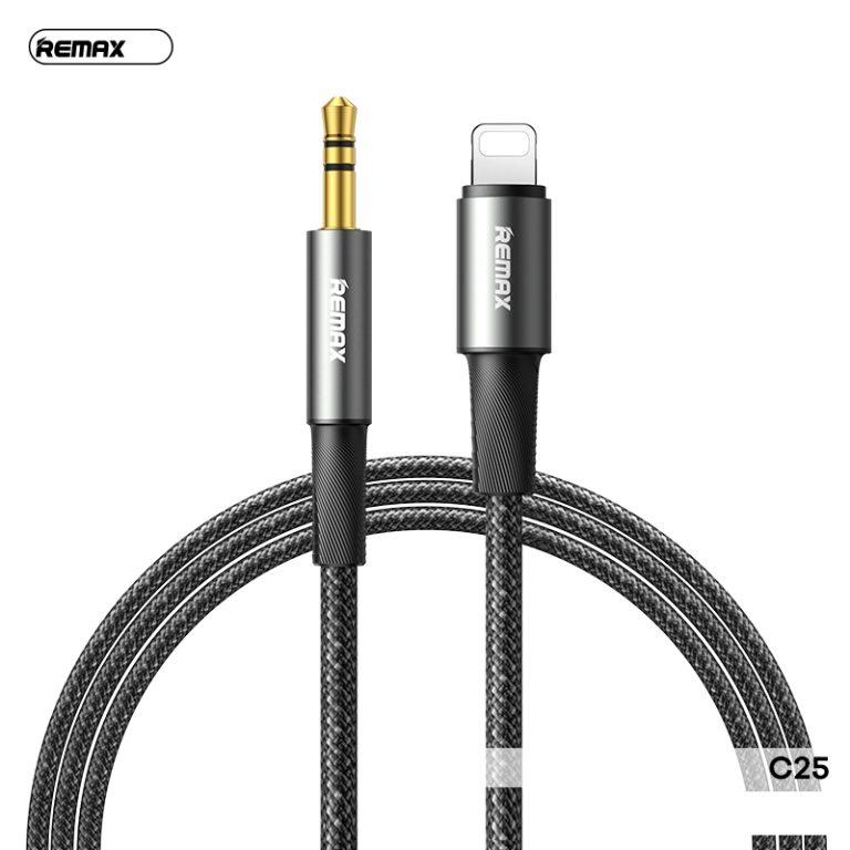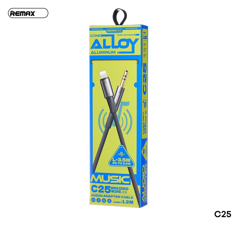 Cáp chuyển Lightning ra 3.5mm đầu đực Remax C25, dây bện 48 trục, vỏ hợp kim nhôm, công nghệ ép phun, chiều dài 1.2m, tuổi thọ 5000 lần cắm rút, mang lại âm thanh trung thực và độ bền vượt trội cho iPhone, iPad