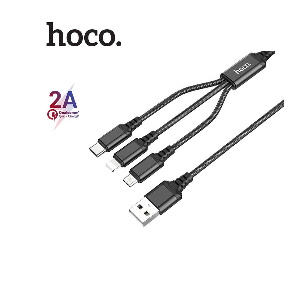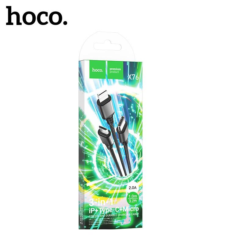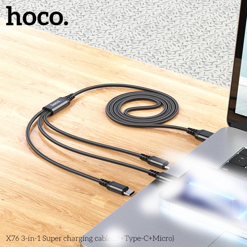 Cáp sạc 3 đầu Hoco X76 dài 1m, hỗ trợ sạc nhanh 2.8A, dây dù chống rối, lõi đồng dẫn điện nhanh, chip thông minh bảo vệ thiết bị, tương thích đa dạng smartphone và tablet