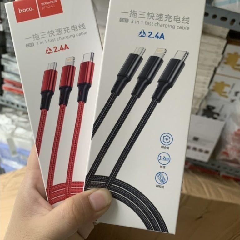 Cáp Sạc Nhanh Hoco CX3 2.4A, dây dài 1.2m, trọng lượng nhẹ 38g, 3 đầu Lightning, Micro, Type-C, vỏ nylon chống đứt chống rối, lõi đồng mạ kẽm 90 sợi bền bỉ, sạc nhanh nhiều thiết bị cùng lúc, tiện lợi cho iPhone, Samsung, Xiaomi, Huawei.