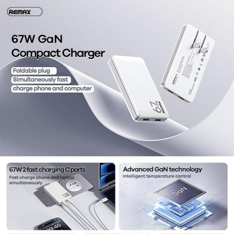 Cốc Sạc Nhanh 67W Remax RP-U17, công nghệ GaN siêu mỏng, sạc đa thiết bị USB-C và USB-A, công suất tối đa 67W, an toàn chống quá dòng, di động lý tưởng cho du lịch, tương thích điện thoại, tablet, laptop.