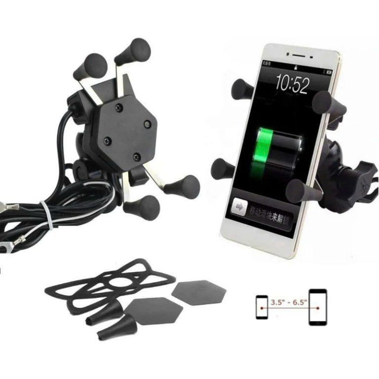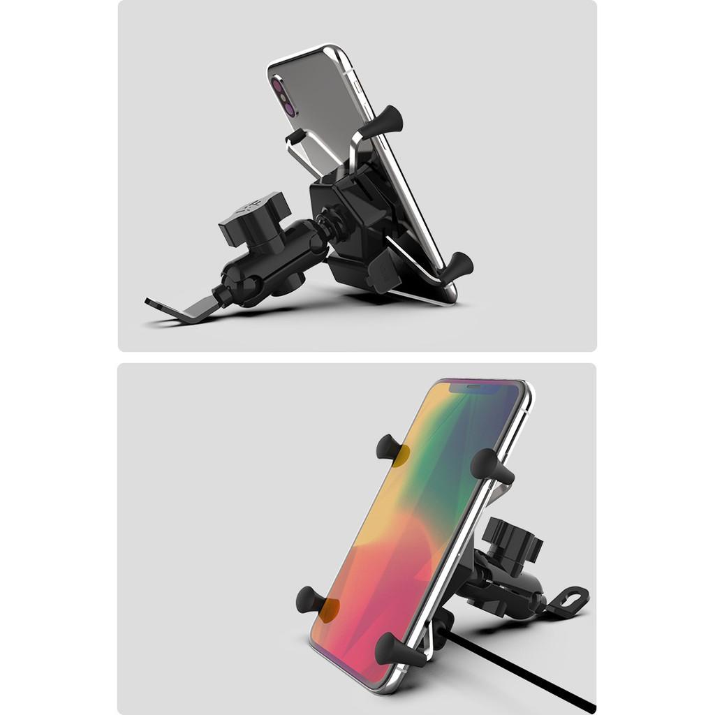 Giá kẹp điện thoại xe máy 4 chân chữ X, có cổng sạc nhanh tiện lợi, thiết kế chắc chắn cứng cáp, giữ điện thoại an toàn chống rơi, kèm dây thun cố định, gắn được ở chân gương hoặc ghi đông, hỗ trợ xem bản đồ và làm camera hành trình