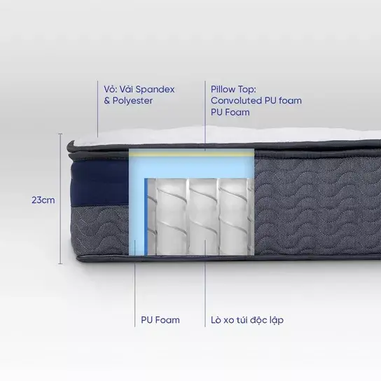Nệm lò xo Amando Elite Original túi độc lập dày 23cm là giải pháp hoàn hảo cho giấc ngủ sang trọng và cân bằng. Đây là sản phẩm tiêu chuẩn khách sạn 5 sao, được sản xuất chính hãng tại Việt Nam với công nghệ lò xo túi độc lập chuẩn quốc tế, mang lại khả năng nâng đỡ cơ thể tối ưu, giảm tiếng ồn khi xoay trở và đảm bảo sự yên tĩnh tuyệt đối. Lớp PU foam thoáng khí giúp tản nhiệt nhanh, giảm mồ hôi, tạo cảm giác mát mẻ và thoải mái trong mọi điều kiện khí hậu.