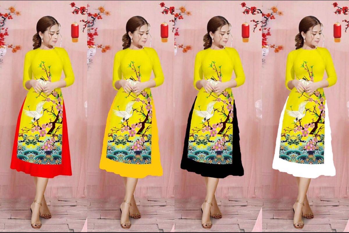 Áo dài cách tân Chim Vàng Tết sang trọng, vải tằm ướt mềm mại, váy silk cát cao cấp, giá sỉ tận xưởng, phù hợp nhiều vóc dáng
