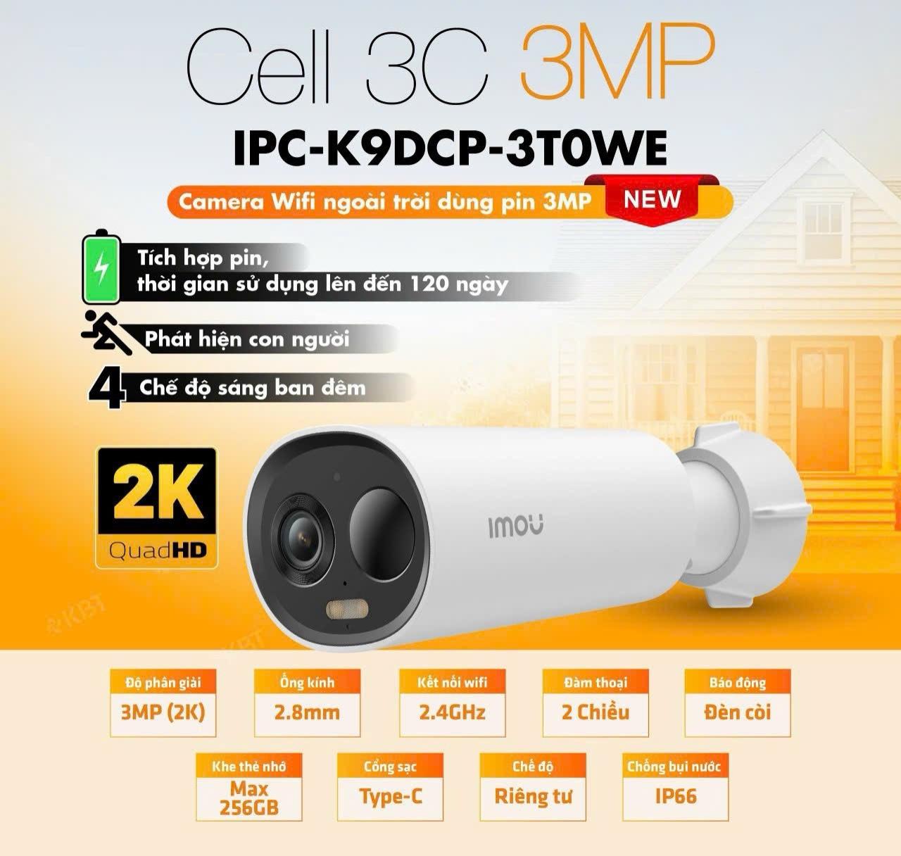 Camera ngoài trời IMOU Cell 3C 3MP IPC-K9DCP-3T0WE-V2 WiFi, lắp nhanh không dây, góc nhìn 121°, đàm thoại hai chiều, hỗ trợ thẻ nhớ microSD tới 256GB, giúp bạn xem rõ người/xe dù trời tối – an tâm 24/7.