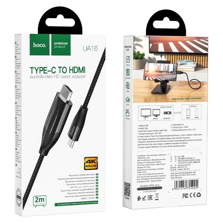 Cáp chuyển Hoco UA16 Type-C ra HDMI 4K, dây dài 2m, hỗ trợ video 3840×2160, tương thích Mac OS, Linux, Windows, thiết kế nhỏ gọn, chỉ cắm là dùng ngay