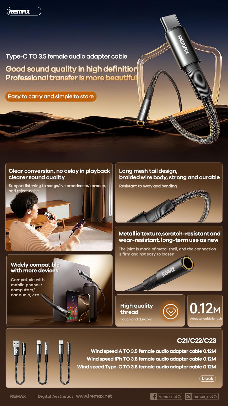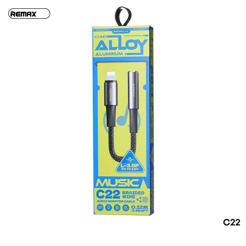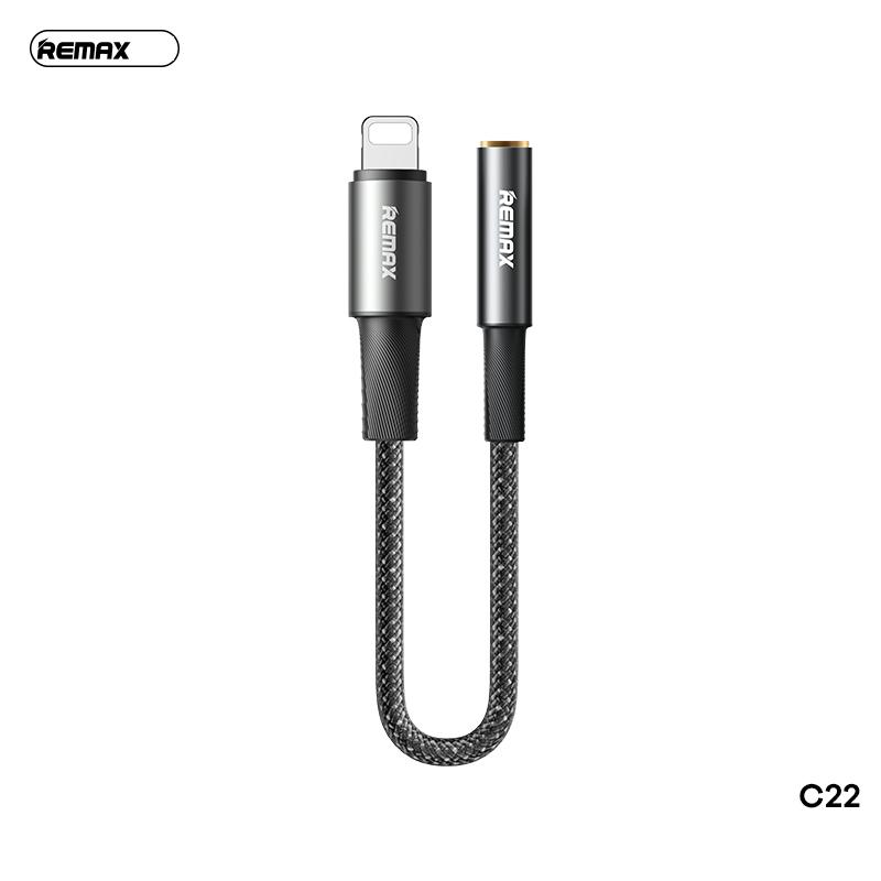 Cáp chuyển Lightning sang tai nghe 3.5mm Remax C22, dây bện 48 trục, vỏ hợp kim nhôm, công nghệ ép phun, chiều dài 0.12m, tuổi thọ 5000 lần cắm rút, thiết kế nhỏ gọn, tiện lợi, mang lại âm thanh trung thực cho iPhone