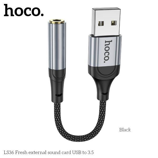 Cáp chuyển USB sang tai nghe 3.5mm Hoco LS36 dài 12cm, dây bện kim loại bền chắc, hỗ trợ mic và điều khiển đường dây, thiết kế nhỏ gọn, tiện lợi, mang lại âm thanh trung thực, tương thích nhiều thiết bị PC, laptop, loa, tai nghe