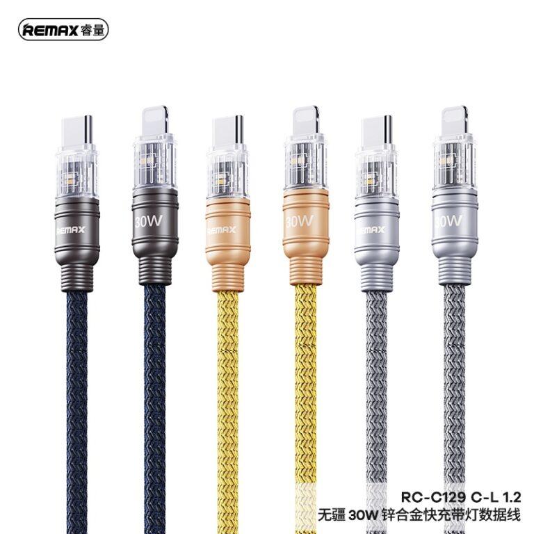 Cáp sạc nhanh Remax RC-C129 30W, Type-C to Lightning, dây dài 1.2m, chất liệu hợp kim kẽm + dây bọc dù, hỗ trợ sạc nhanh 15V/2A, truyền dữ liệu tốc độ cao, màu xanh/xám bạc/vàng, thiết kế sang trọng, bền bỉ vượt trội cho iPhone và iPad