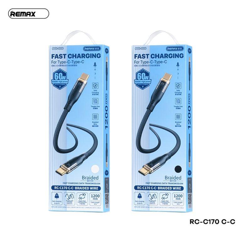 Cáp Sạc Nhanh Remax RC-C170 60W, dây sạc 2 đầu Type-C dài 1m, chip thông minh tự điều chỉnh dòng sạc, hỗ trợ laptop 30W-45W-60W, dây vải bện mật độ cao chống rối chống gãy, đầu cáp mạ kim loại bền bỉ, truyền dữ liệu tốc độ 480Mbps.