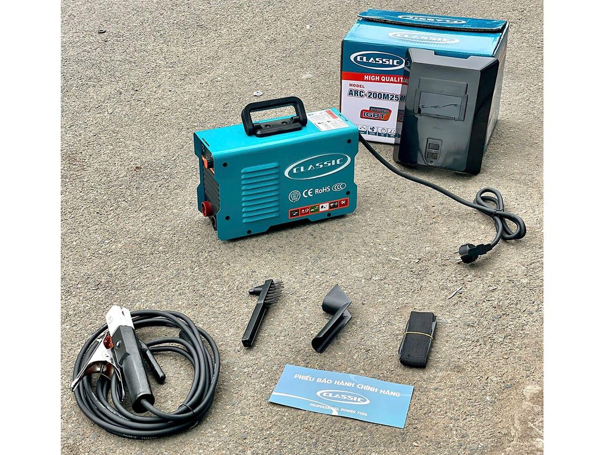 - PHỤ KIỆN ĐẦY ĐỦ Máy hàn que classic arc200m25 và lợi ích kìm hàn kẹp mass búa gõ xỉ mặt nạ hàn sẵn sàng sử dụng dành cho thợ hàn lâu năm.