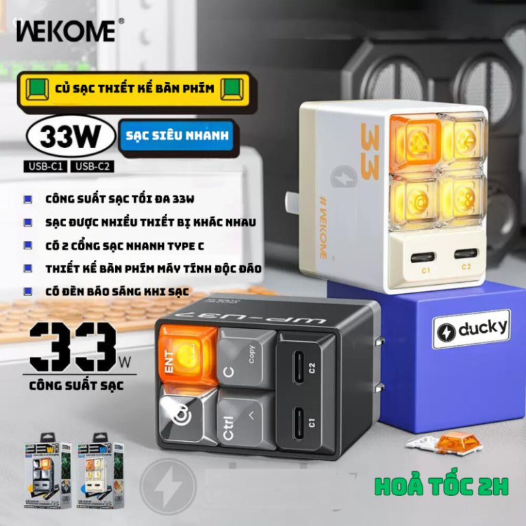 Cóc sạc nhanh Wekome WP-U37 33W sở hữu thiết kế độc đáo lấy cảm hứng từ bàn phím cơ, mang đến vẻ ngoài hiện đại, khác biệt và tinh tế. Sản phẩm được trang bị công suất tối đa lên đến 33W, hỗ trợ sạc nhanh cho nhiều thiết bị như điện thoại thông minh, máy tính bảng, laptop, tai nghe và các thiết bị công nghệ khác. Cổng ra đa năng USB-A và Type-C giúp tương thích với hầu hết các dòng máy hiện nay, đảm bảo dòng điện ổn định, an toàn trong quá trình sạc. Wekome WP-U37 được chế tạo từ vật liệu nhựa cao cấp chống cháy, chống trầy xước, tăng độ bền và khả năng tản nhiệt hiệu quả. Với hai màu sắc sang trọng Đen và Trắng, thiết kế nhỏ gọn, dễ dàng mang theo trong túi xách hoặc balo, đây là lựa chọn lý tưởng cho người dùng yêu thích sự tiện lợi và phong cách công nghệ hiện đại.