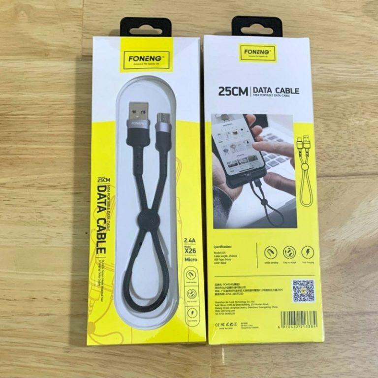 Cáp sạc ngắn Foneng X26 Micro 25cm là phụ kiện tiện lợi dành cho người dùng smartphone Android và các thiết bị Micro USB. Với chiều dài 25cm và trọng lượng chỉ 11g, sản phẩm nhỏ gọn, dễ dàng mang theo, phù hợp cho nhu cầu sạc nhanh khi di chuyển hoặc sử dụng cùng pin dự phòng.