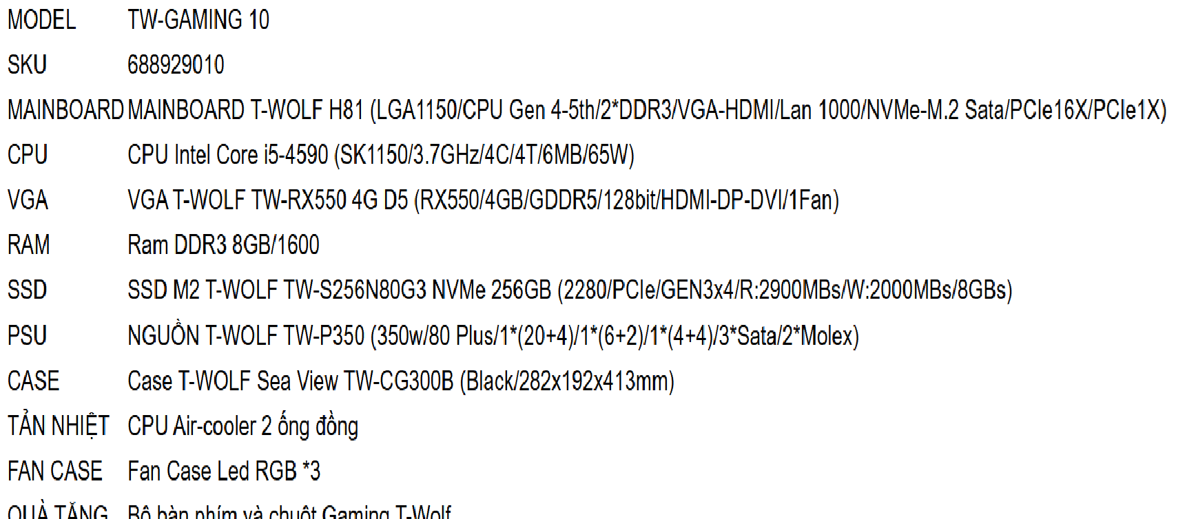 Máy bộ gaming T-WOLF TW Gaming 10 là lựa chọn hoàn hảo dành cho game thủ, người sáng tạo nội dung và người làm việc chuyên sâu yêu cầu hiệu năng cao. Với bộ vi xử lý mạnh mẽ, dung lượng RAM lớn và card đồ họa tối ưu, sản phẩm mang lại trải nghiệm chơi game mượt mà, đồ họa sắc nét và khả năng xử lý đa nhiệm vượt trội.