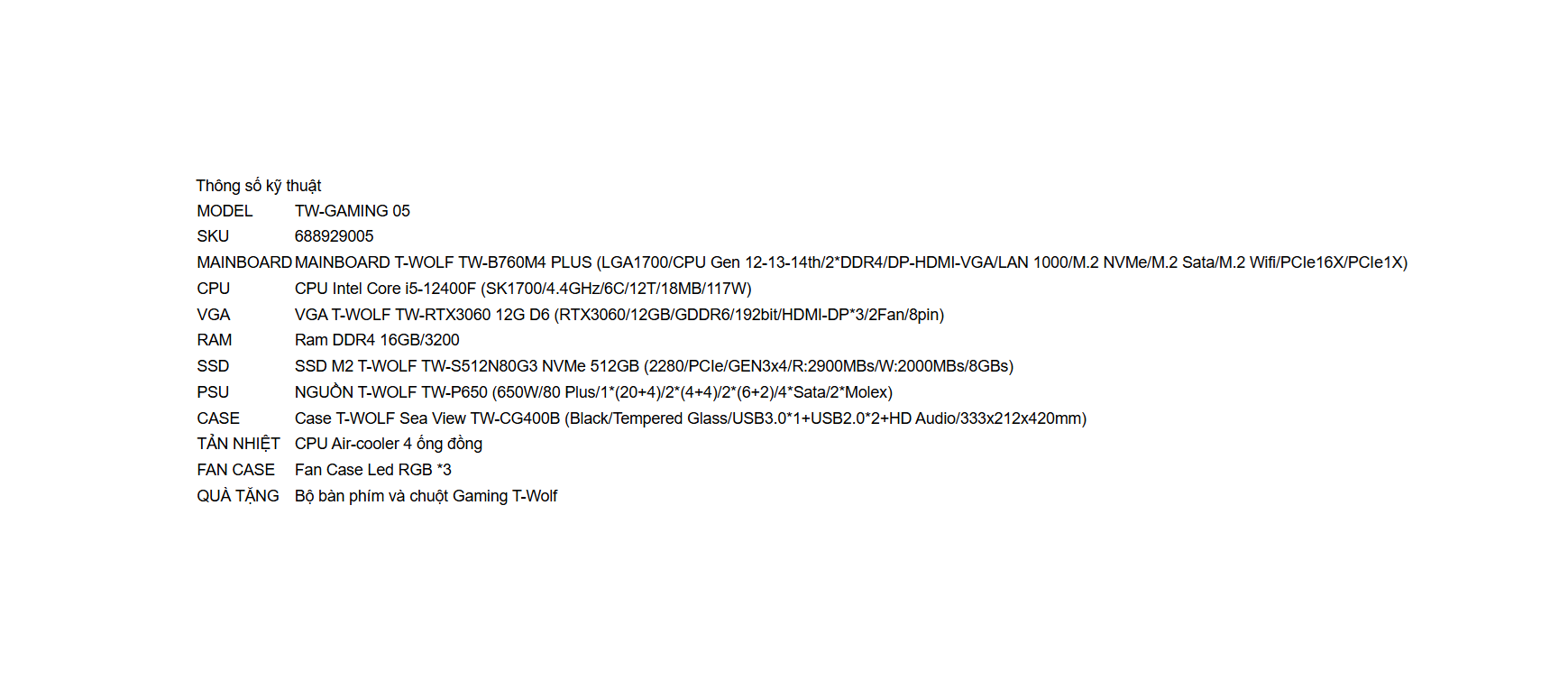 Máy Bộ T-Wolf TW-GAMING 05, PC Chơi Game Cao Cấp, SSD Siêu Tốc, RAM 16GB, Card Đồ Họa GTX, Case RGB, Trải Nghiệm Gaming Mượt Mà