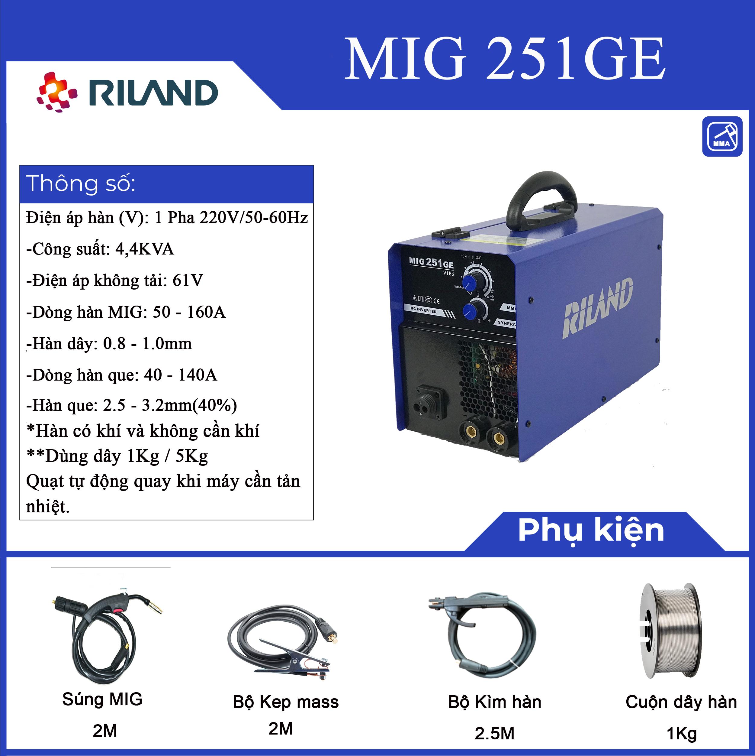 Máy hàn Riland MIG 251GE, công nghệ IGBT tiên tiến, hàn MIG và hàn Que, hàn có khí hoặc không khí, mối hàn siêu đẹp tốc độ nhanh, hợp kim chắc chắn, nhỏ gọn dễ di chuyển, bảo hành chính hãng 12 tháng