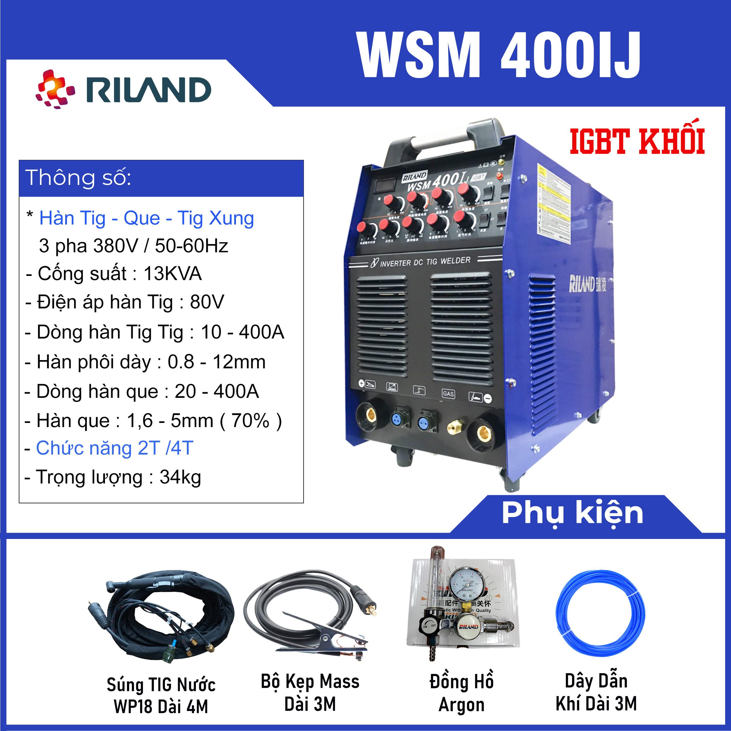 Máy hàn RILAND WSM 400IJ TIG xung & que 400A, hỗ trợ 3 chế độ (TIG / Pulse / MMA), điều chỉnh sóng, tần số & khí trễ, hàn vật liệu Ø0,5-12 mm, quạt tản nhiệt mạnh, bảo hành 18 tháng — mối hàn bền ổn
