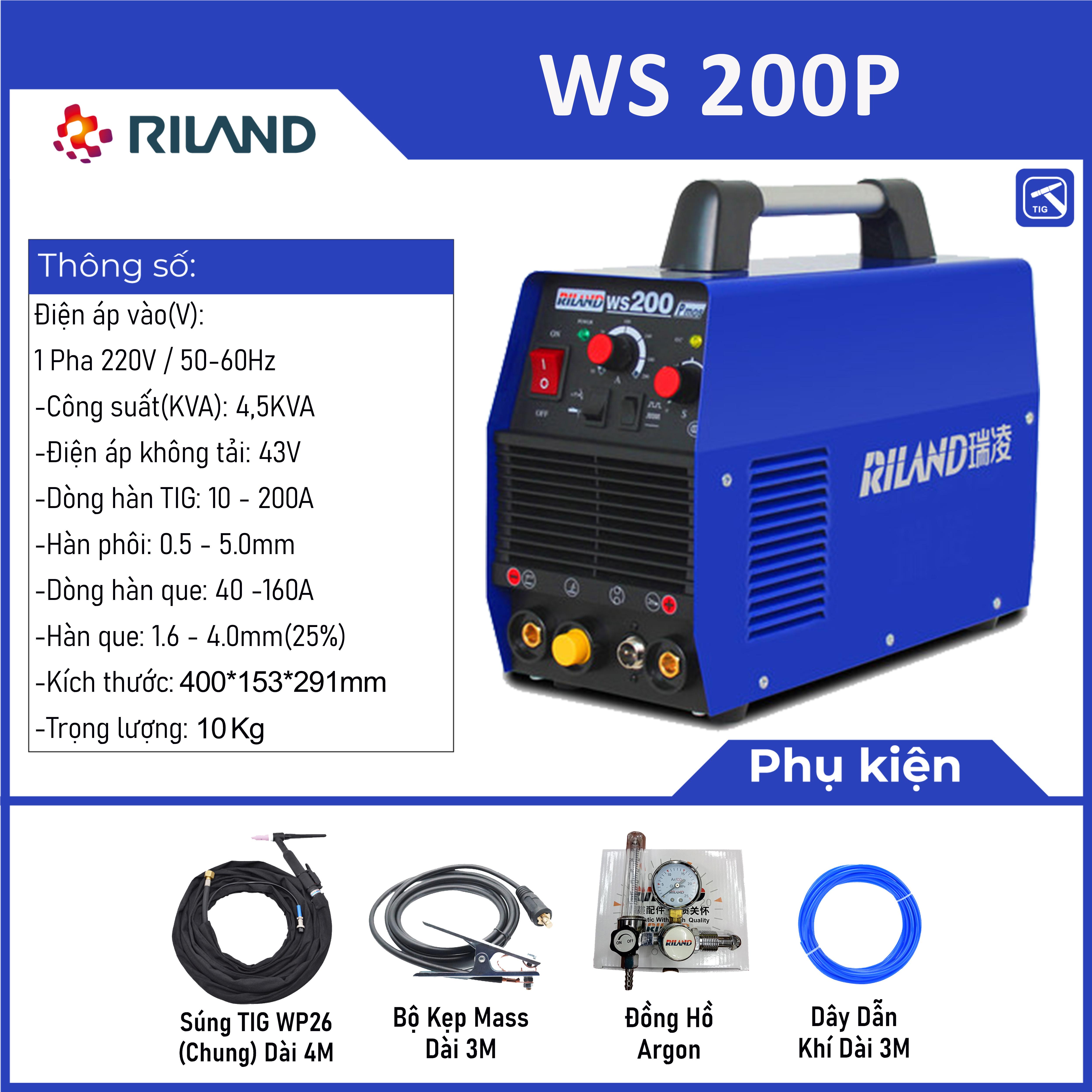 Máy hàn TIG Riland WS 200P inverter Pulse, dòng 10-200A, chế độ TIG + Pulse + MMA, trễ khí linh hoạt, hỗ trợ điều khiển từ xa, thiết kế nhỏ gọn & bền, mối hàn đẹp & ổn định