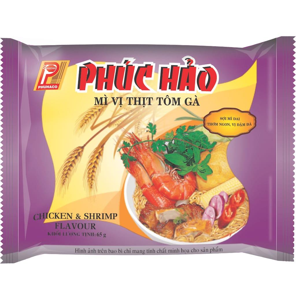 Mì Thịt Tôm Gà Phúc Hảo 65gr tiện dụng, vị truyền thống đậm đà hòa quyện thịt tôm & gà, đóng gói thùng, bảo quản lâu, nhanh gọn phục vụ gia đình & văn phòng – lựa chọn lý tưởng cho bữa ăn nhanh, thơm ngon & an tâm