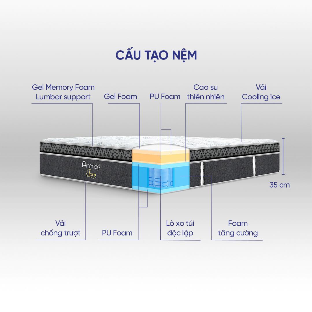 Nệm lò xo túi Amando Faro, thiết kế đa tầng, Gel Memory Foam Lumbar Support, PU foam đàn hồi, lõi cao su ôm sát, nâng đỡ 5 vùng cơ thể, bảo vệ cột sống, giấc ngủ êm ái và khỏe mạnh.