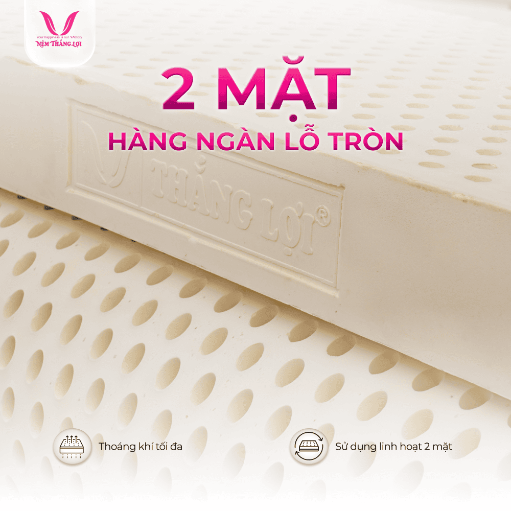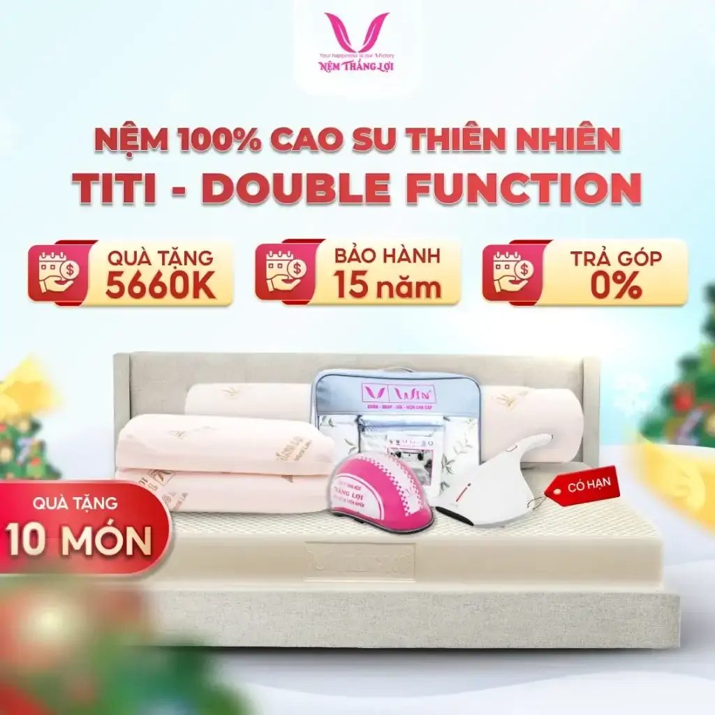 Nệm Thắng Lợi TiTi Cao Su Thiên Nhiên, Double Function, công nghệ tiên tiến, loại bỏ mùi cao su, hương vanilla dễ chịu, kháng khuẩn, thoáng mát, bảo hành 15 năm, giấc ngủ thư giãn.