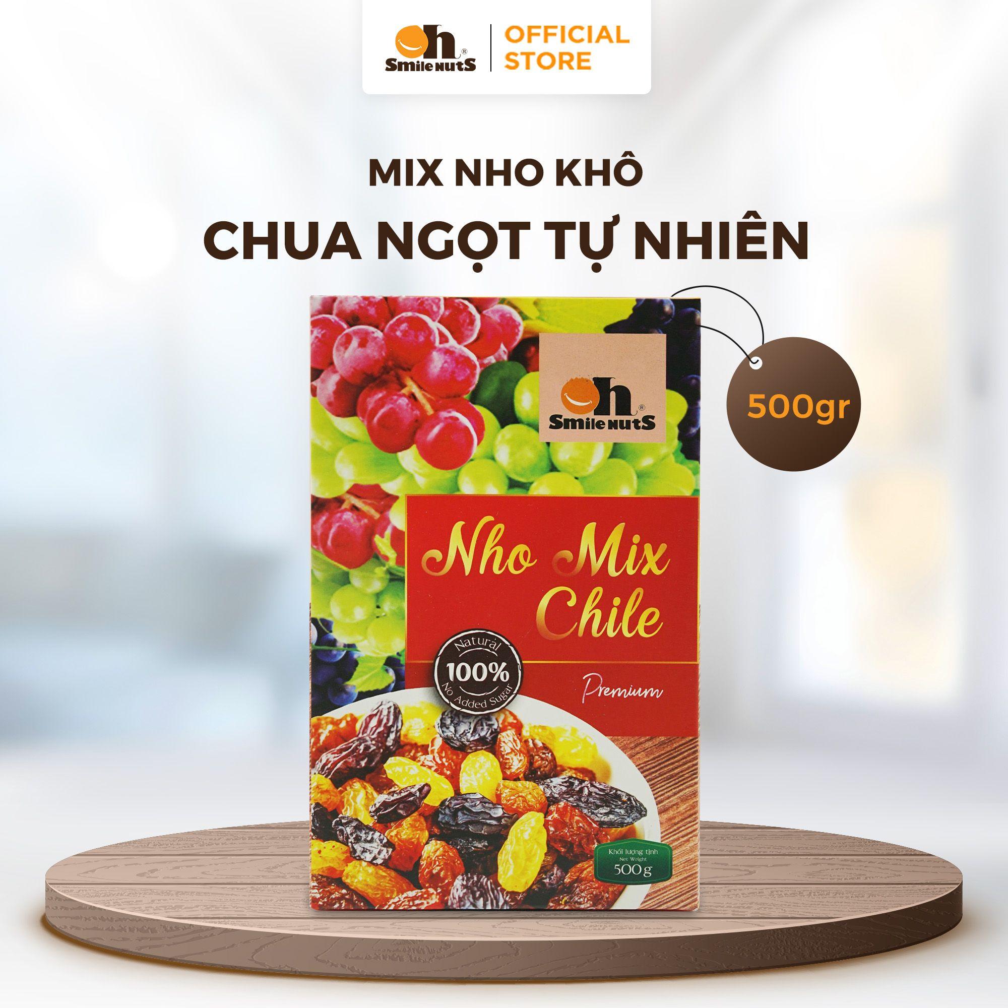 Nho Khô Mix Chile, Hộp Giấy 500 g Oh Smile Nuts, Hỗn hợp nho đỏ nho vàng nho đen nhập khẩu Chile, vị ngọt thanh tự nhiên, sấy khô không đường tinh luyện, lựa chọn snack healthy cho người ăn kiêng