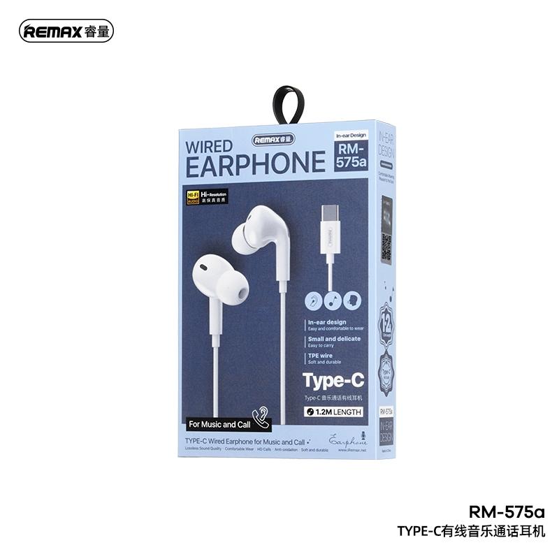 Tai Nghe Remax RM-575a Cổng Type-C Chính Hãng, Âm Thanh HiFi Chất Lượng Cao, Trở Kháng 32Ω, Công Suất Loa 3mW, Màu Trắng Tinh Tế, Thiết Kế Nhét Tai Công Thái Học, Micro Tích Hợp, Dây Bền Bỉ, Giải Pháp Nghe Nhạc Và Đàm Thoại Hoàn Hảo Cho Người Dùng An