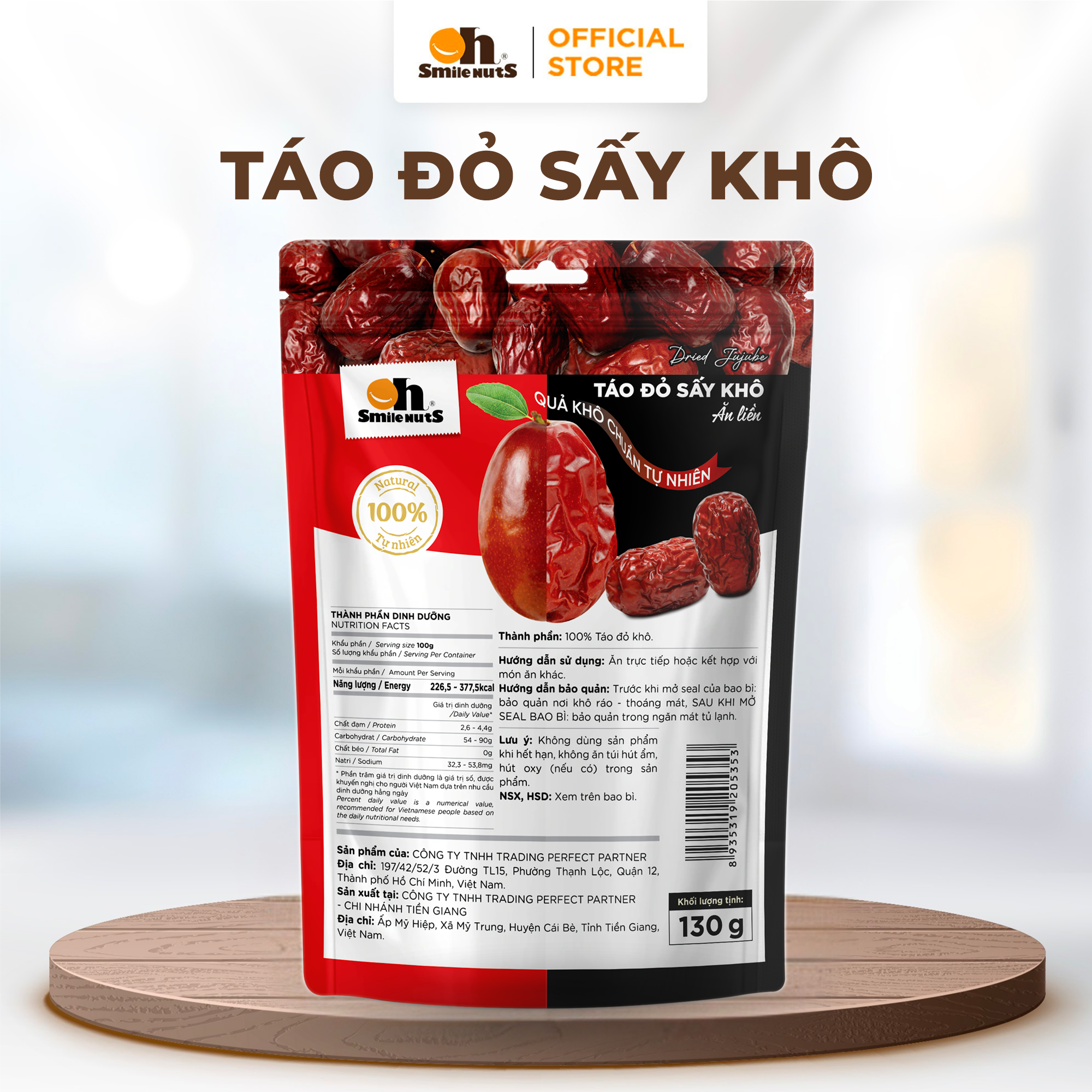Táo Đỏ Khô Tân Cương Túi 500g Oh! Smile Nuts, sử dụng nguyên liệu táo đỏ lâu năm, thổ nhưỡng đặc biệt vùng Tân Cương giúp quả ngọt hơn, hộp gọn 130g dễ bảo quản, lý tưởng dùng mỗi ngày hoặc mang đi du lịch
